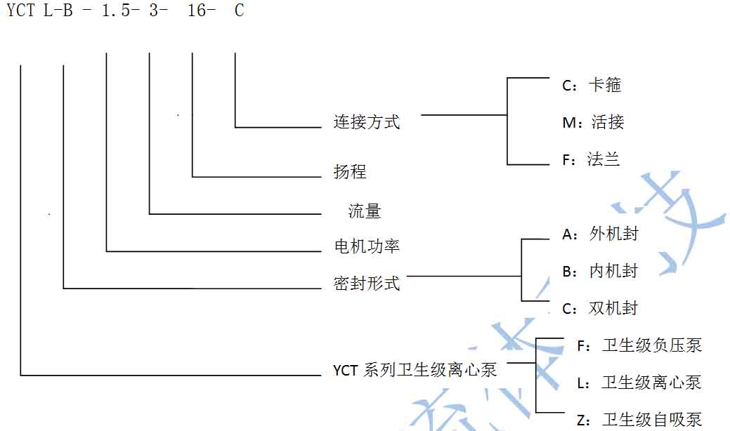 衛(wèi)生級離心泵是一種衛(wèi)生級機構(gòu)設(shè)計的離心泵。 衛(wèi)生級離心泵主要用于制藥、食品、化妝品等衛(wèi)生流體的輸送。如:制藥用水輸送--WFI注射用水/純化水輸送,也可用于其他衛(wèi)生級要求的場。根據(jù)使用場合和結(jié)構(gòu)工藝等也可稱為:衛(wèi)生級注射水泵,衛(wèi)生級純化水泵,衛(wèi)生級麥芽汁泵,衛(wèi)生級濃縮提取泵,,GMP衛(wèi)生級離心泵,無菌衛(wèi)生泵,防爆衛(wèi)生級離心泵,變頻防爆衛(wèi)生泵 衛(wèi)生級離心泵參數(shù): 規(guī) 格: 3T-180T, 0.55KW-75KW 材 質(zhì): SUS304 SUS316L (在材料的選用上泵體、泵蓋、葉輪等凡與物料接觸之零件由SUS316L或SUSI304不銹鋼制造), 標 準: DIN、 SMS 葉 輪:敞開式葉輪,不留衛(wèi)生死角 工作條件:衛(wèi)生離心泵屬高低液位幾水平輸送,非自吸型。(自吸型選用自吸泵) 表面處理:接液部分拋光,其余亞光或噴砂處理。 最大進口壓力:0.5MPa 溫度范圍:-10°C至+140°C(EPDM) 可沖洗機械密封: 水壓:最高0.1MPa 水量:0.25-0.5L/min 電 機: 1.根據(jù)配置主要采用“ABB”品牌的三相交流電機,按照國際電工委員會IEC60034.IEC60072標準設(shè)計制作,符合歐共體“CE”標記要求。 2.可供選用防爆電機,以滿足不同場合的需要。 3.優(yōu)越的電氣性能、低噪音、低震動,電機的標準設(shè)計防護等級為IP55,絕緣等級為F級。 4.工作電壓: ≤3Kw,220-240V/380-420V,△/Y >3Kw,380-420V/660-690V, △/Y 5.頻率:50Hz/60Hz 6.工作方式:連續(xù)(SI) 7.轉(zhuǎn)速:標準泵的轉(zhuǎn)速為2900r/min 衛(wèi)生級離心泵過程示意圖: 衛(wèi)生級離心泵常規(guī)型號選型表: YCT衛(wèi)生級離心泵型號說明: 衛(wèi)生級離心泵外形尺寸圖: